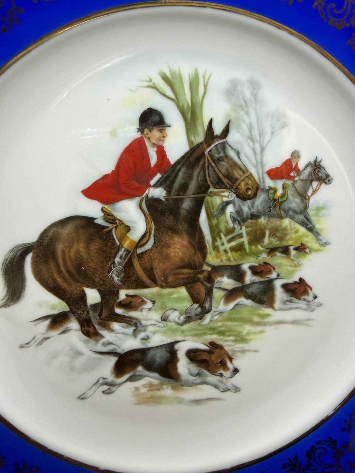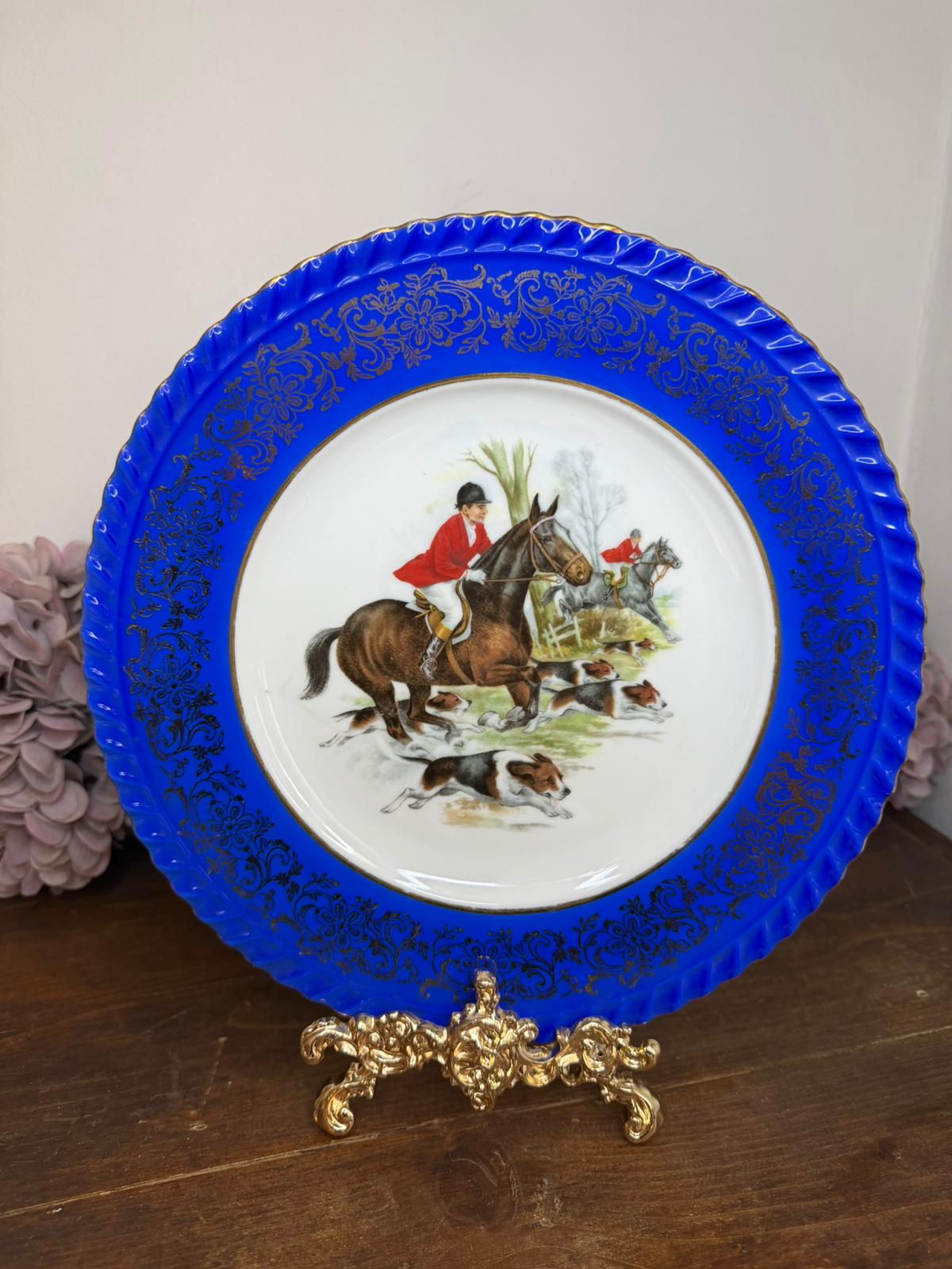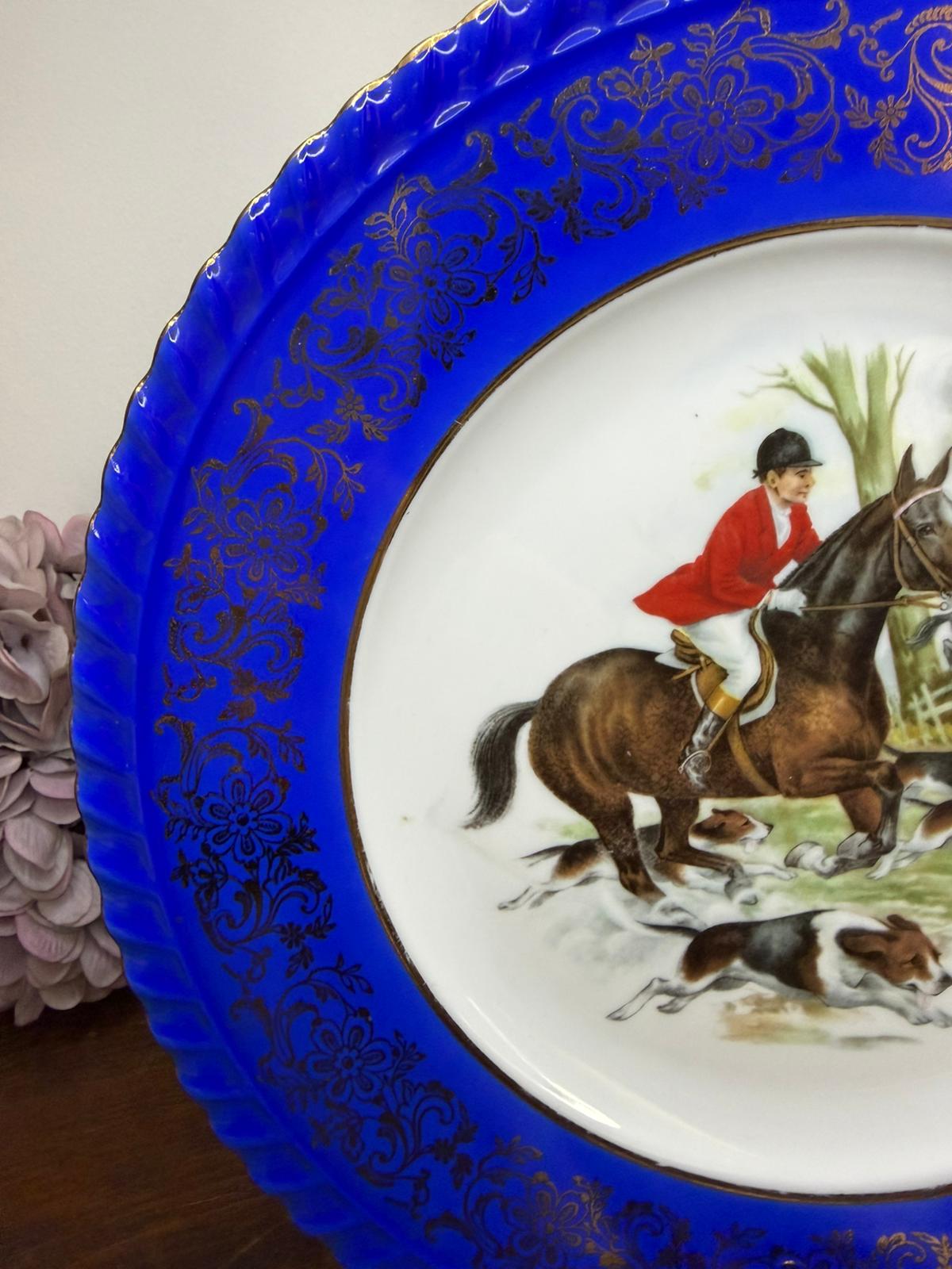 Piatto Bavaria con scene di caccia e bordo blu e oro.